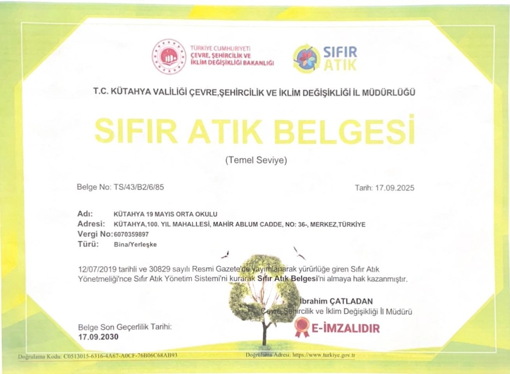 T.C. Çevre, Şehircilik ve İklim Değişikliği Bakanlığı'nın tüm kamu kurumlarında uygulanmak üzere geliştirdiği "Sıfır Atık Projesi" okulumuzda hayata geçirildi. İsrafın önlenmesi, kaynakların daha verimli kullanılması ve atıkların toplanarak geri kazanımının sağlanması ile ilgili yapmış olduğumuz çalışmalar neticesinde Sıfır Atık Belgesi'ni almaya hak kazanmıştır.